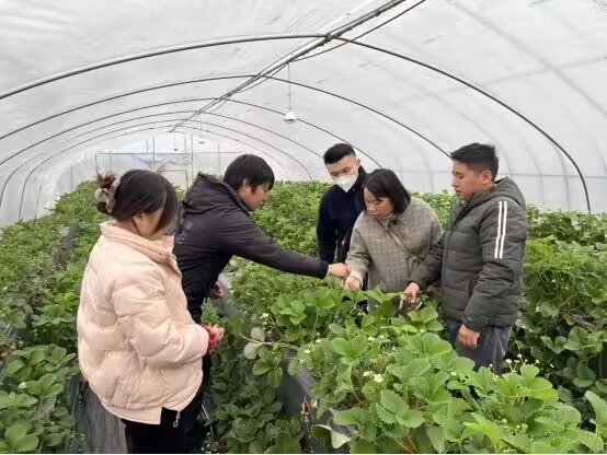 培训结束后,科技服务团队来到基地草莓超高垄种植现场,查看草莓生产状况,发现由于该基地夜间不合理采用浴霸补光的方式,导致草莓徒长和果实偏小现象严重,针对这一情况,团队现场讲解如何合理使用浴霸补光加温,并提出了采用蜡烛加温的低成本加温方式等。由于今年冬季气温偏高,红蜘蛛、蓟马病害和白粉病等严重,团队现场讲解今年易发病虫害的有效防治方法,并指导该基地负责人用药量和用药周期,及时防治病虫害。团队还为该基地的草莓+甜瓜种植提前讨论出可行性的实施方法,以此提高该基地的生产效益。