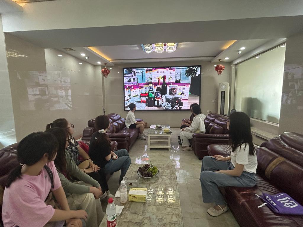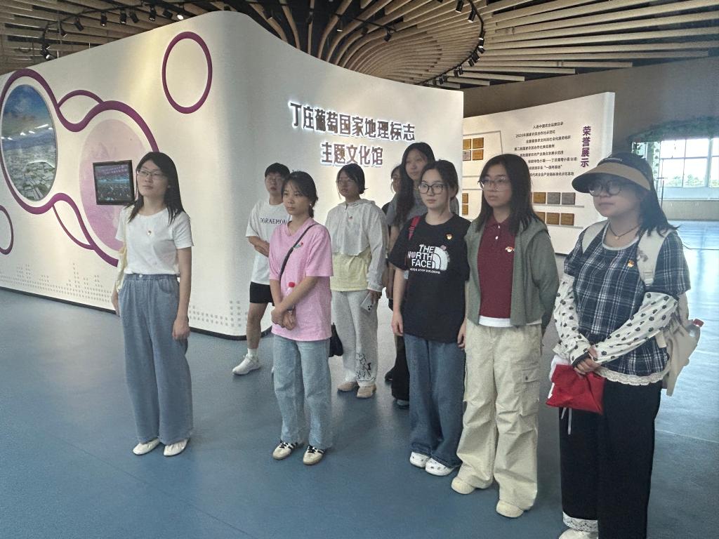 随后,大家参观了丁庄葡萄国家地理标志主题文化馆与农产品展销馆。从品牌历史、地理标志保护、标准化生产到文化创意衍生品,讲解员系统介绍了丁庄葡萄从“一粒种子”到“一个品牌”的发展历程。展馆中先进的沉浸式展示技术,让师生对现代农业全产业链建设有了更直观和系统的认识。