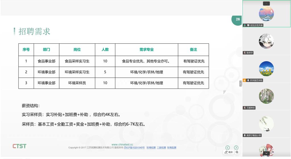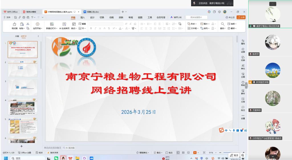 为了给毕业生提供优质的就业服务和广阔的就业渠道,3月25日,省作物学会联合理事长单位举办2026届毕业生春季网络招聘会,南京宁粮生物工程有限公司、江苏百阳垦生物技术有限公司等15家企业通过腾讯会议进行招聘宣讲。